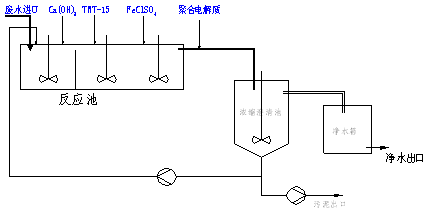 先在廢水中加入石灰乳或其它堿性化學(xué)試劑(如:NaOH等),將pH值調(diào)至6~7,為后續(xù)處理工藝環(huán)節(jié)創(chuàng)造良好的技術(shù)條件,同時在該環(huán)節(jié)可以有效去除氟化物(產(chǎn)品CaF2沉淀)和部分重金屬。然后加入石灰乳、有機(jī)硫和絮凝劑,將pH升至8~9,使重金屬以氫氧化物和硫化物的形式沉淀。